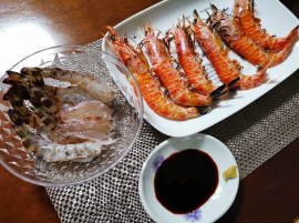 なんの準備もしてなかったのですが、新鮮な海老を食べるなら刺身と塩焼きと思いサッサと捌いて晩御飯のおかずにしました。(盛り付けの見た目が悪くてスイマセン。。)
