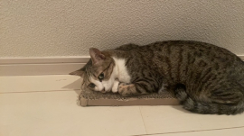 雉シロ猫のウメちゃんは、使い込んだボロボロの爪とぎがお気に入りすぎて、いつもいつもうっとりこの表情・・・(笑)