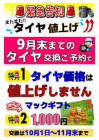 10月も4本交換で、マックカード1,000円差し上げておりますが、タイヤ価格は値上げ後となります💧
